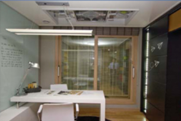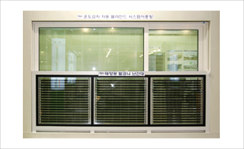 - 별도의 외장 마감재 비용이 필요없으며 솔라셀이 부탁된 복층유리 내부의 슬랫이 차양 기능을 수행하여 여름철 실내로 유입되는 직사광 방지 기능